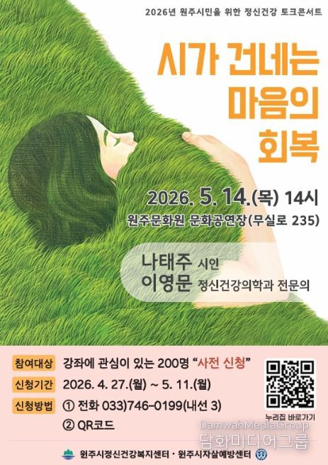 시민행정신문 강갑수 기자 | 원주시정신건강복지센터는 다음 달 14일 원주문화원 문화공연장에서 ‘시가 건네는 마음의 회복’을 주제로 정신건강 토크콘서트를 개최한다.