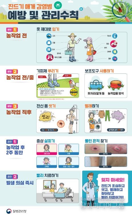 진드기 매개 감염병 예방 수칙으로는 ▲야외 활동 시 긴 소매, 긴 바지, 모자, 장갑, 장화 등을 착용하여 피부 노출 최소화 하기 ▲기피제 사용하기 ▲휴식 시 돗자리 사용하기 ▲ 야외 활동 후 즉시 샤워 및 세탁하기 등이 있다.