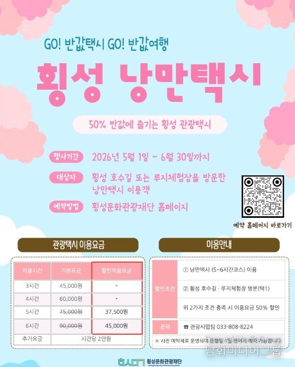 시민행정신문 강갑수 기자 | 횡성군과 횡성문화관광재단이 운영하는 횡성 낭만택시가 오는 5월 1일부터 6월 30일까지 이용요금 50% 할인 행사를 실시한다고 밝혔다.