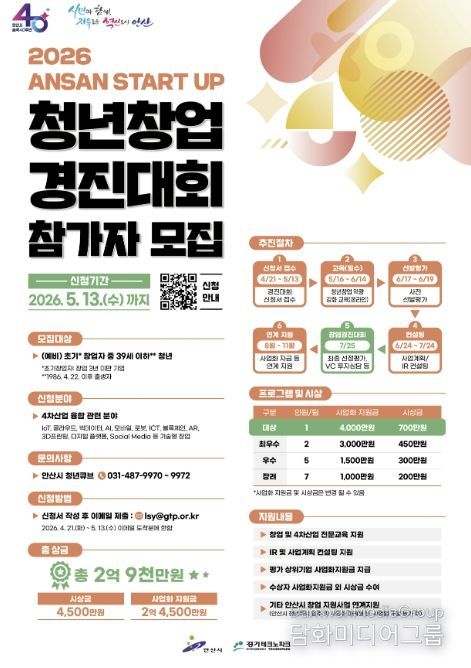 시민행정신문 강갑수 기자 | 안산시는 창의적인 아이디어를 보유한 청년 창업가를 발굴하기 위해 내달 13일까지 ‘2026 안산 스타트업 청년창업 경진대회’ 참가자를 모집한다고 24일 밝혔다.