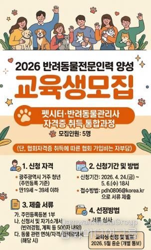시민행정신문 강갑수 기자 | 광주광역시는 반려동물 산업 성장에 대응하고 전문역량을 갖춘 인재 양성을 위한 ‘2026년 반려동물 전문인력 양성교육’을 실시한다.