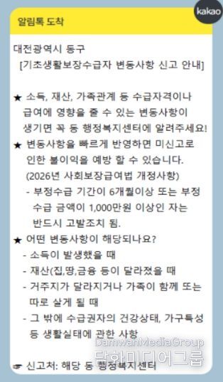 시민행정신문 강갑수 기자 | 대전 동구는 국민기초생활보장 생계급여 수급자를 대상으로 ‘변동사항 신고 알림톡’ 서비스를 본격 운영한다고 24일 밝혔다.