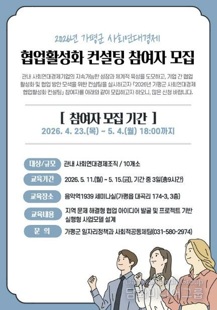 시민행정신문 강갑수 기자 | 가평군이 사회연대경제 조직 간 협업 활성화를 위해 ‘2026년 사회연대경제 협업활성화 컨설팅’을 추진하고, 참여 조직을 5월 4일까지 모집한다.