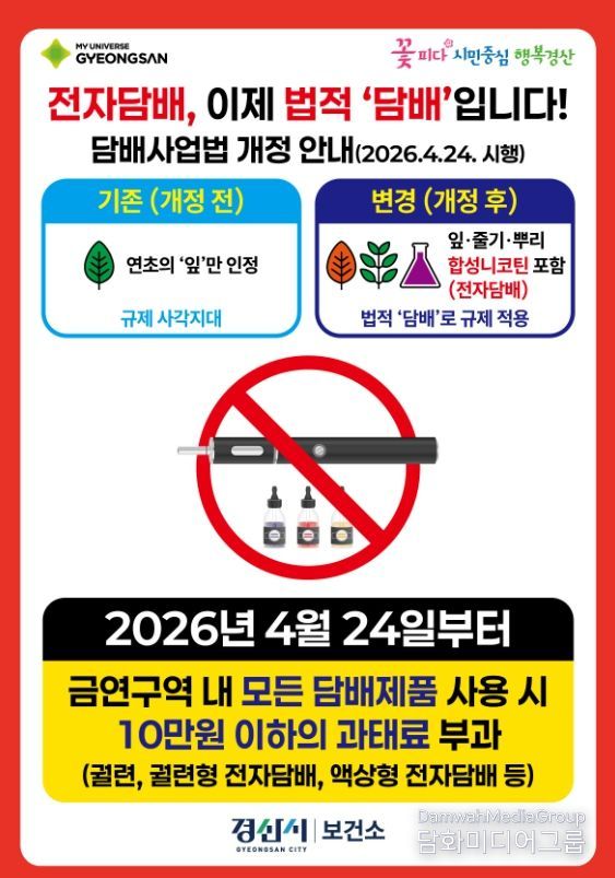 시민행정신문 기자 | 경산시는 4월 24일부터 5월 15일까지 3주간 경산시보건소, 일자리경제과, (사)한국외식업중앙회 경산시지부와 함께 담배사업법 개정에 따른 법령 준수 정착을 위해 금연 구역 내 흡연 행위에 대한 집중 지도와 점검을 실시한다.