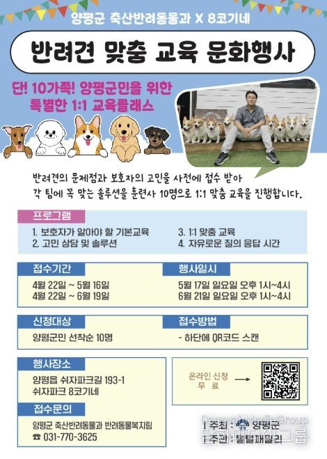 이번 교육은 양평 쉬자파크에서 5월 17일과 6월 21일 오후 1시부터 4시까지 진행되며, 회차별 사전 신청을 통해 선정된 10팀씩 총 20팀을 대상으로 운영된다. 특히 양평군 홍보대사이자 45만 구독자를 보유한 유튜브 채널 ‘8코기네’의 전승우 훈련사와 반려견 행동전문가 10명이 참여해 일대일 맞춤형 야외 실습과 현장 교정 지도를 제공할 예정이다.