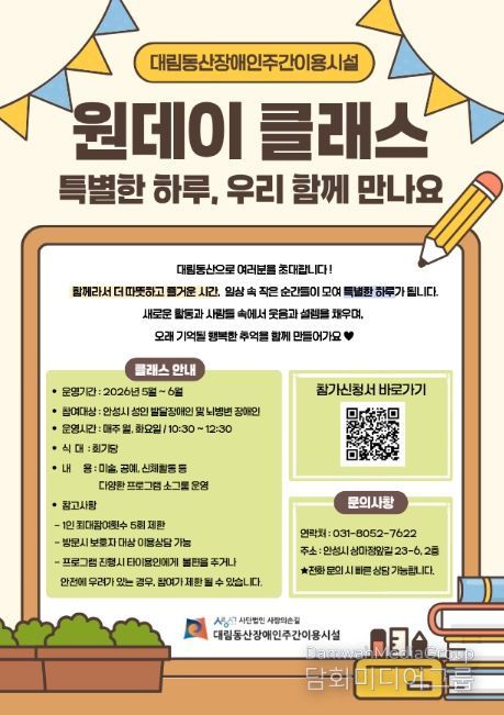 참여를 희망하는 경우 포스터 내 QR코드를 통해 신청서를 제출하거나, 대림동산장애인주간이용시설로 문의하면 자세한 안내를 받을 수 있다.