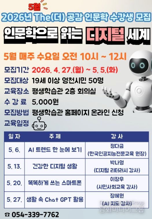 시민행정신문 강갑수 기자 | 영천시 평생학습관은 시민의 인문학적 소양 함양을 위해 운영하는 ‘The(더) 공감 인문학 특강’ 5월 수강생을 27일부터 5월 5일까지 모집한다고 밝혔다.