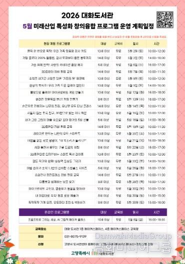 시민행정신문 기자 | 고양특례시 대화도서관은 가정의 달을 맞아 오는 5월 ‘미래산업 특성화 창의융합 프로그램’을 운영한다고 24일 밝혔다.