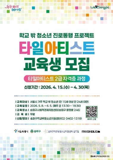시민행정신문 강갑수 기자 | 송파구는 서울시 ‘약자와의 동행’ 공모사업으로 학교 밖 청소년들의 사회진입과 자립을 돕기 위한 ‘타일아티스트 교육’을 실시한다고 24일 밝혔다.