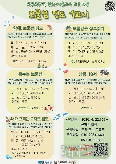 영도구 관계자는 “보물섬영도 1교시는 세대별 삶의 경험을 문화예술로 연결하는 프로그램”이라며 “구민 누구나 일상 속에서 문화예술을 즐기고 영도만의 정체성을 함께 만들어가는 계기가 되기를 기대한다.”고 밝혔다.