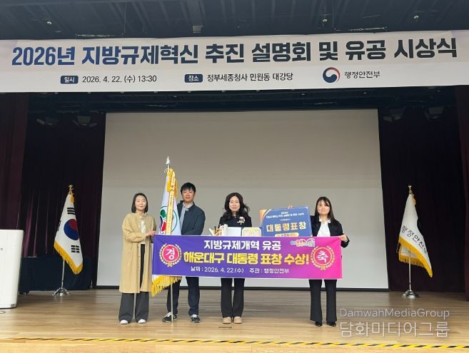 해운대구 관계자는 “이번 대통령 표창은 규제 해소를 위해 현장에서 묵묵히 노력해 온 직원들이 함께 이뤄낸 값진 성과”라며 “앞으로도 구민과 기업이 체감할 수 있는 실질적인 규제혁신 및 적극행정을 지속적으로 추진해 지역 경쟁력과 행정 신뢰도를 높여 나가겠다”고 말했다.