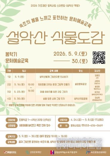 이태훈 사무국장은 “설악산 식물도감을 통해 우리 지역 어린이들이 수려한 자연환경 속에서 글과 그림으로 봄이라는 계절을 자유롭게 표현해 보는 경험을 하길 기대한다”며 “지역적 요구에 부응하는 지역 특성화 문화예술교육 시스템 구축을 위해 강원특별자치도, 강원문화재단, 강원문화예술교육지원센터와 함께 지속적으로 확대해 나가겠다”고 밝혔다.