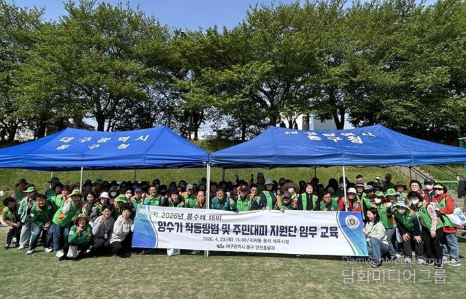 시민행정신문 강갑수 기자 | 대구 동구청은 지난 23일, 지저동 둔치 체육시설에서 동구 지역자율방재단 단원 및 관내 22개 동 행정복지센터 재난안전담당자 120여명이 참여한 가운데 양수기 작동법 및 주민대피지원단 임무 교육을 실시했다.