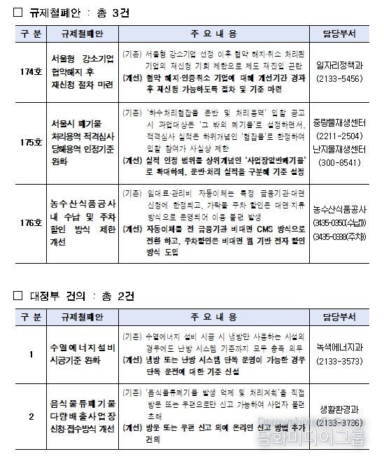 시는 자체적으로 개선 가능한 ▴서울형 강소기업 협약해지 후 재신청 절차 마련(174호) ▴서울시 폐기물 처리용역 적격심사 당해용역 인정기준 완화(175호) ▴농수산식품공사 내 수납 및 주차할인 방식 제한 개선(176호) 과제는 정비하고, ▴수열에너지 설비 시공기준 완화, ▴음식물류폐기물 다량배출사업장 신청․접수방식 개선 등 2건은 정부에 공식 건의했다.