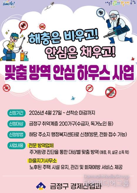 시민행정신문 강갑수 기자 | 부산 금정구는 관내 취약계층의 쾌적하고 안전한 주거 환경 조성을 위해 ‘맞춤 방역 안심하우스’ 사업을 추진하고, 오는 4월 27일부터 대상 가구를 모집한다고 밝혔다.