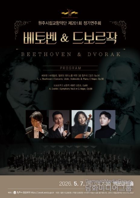 시민행정신문 기자 | 원주시립교향악단 제201회 정기연주회가 오는 5월 7일 오후 7시 30분 백운아트홀에서 개최된다. 이번 연주회에는 지휘자 조규진과 바이올리니스트 김남훈, 첼리스트 홍승아, 피아니스트 신효건이 협연자로 나서 베토벤 3중 협주곡 C장조와 드보르작 교향곡 제8번 G장조를 선보일 예정이다.