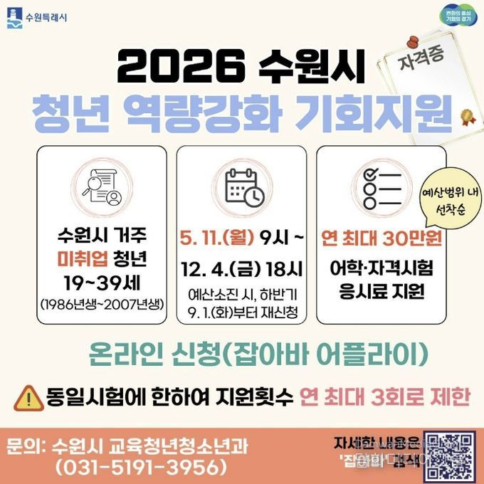 수원시 관계자는 “청년들에게 인기가 높은 사업으로 조기 마감될 수 있는 만큼 지원 대상과 접수 기간을 확인해 신청하길 바란다”며 “취업 준비에 실질적으로 도움이 되길 바란다”고 말했다.