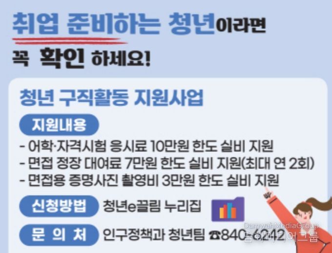 지원 항목은 ▲어학․자격시험 응시료 최대 10만 원 ▲면접 정장 대여료 7만 원(연 2회) ▲면접 증명사진 촬영비 3만 원(연 1회) 등으로, 각 항목별 기준에 따라 실비를 지원한다.