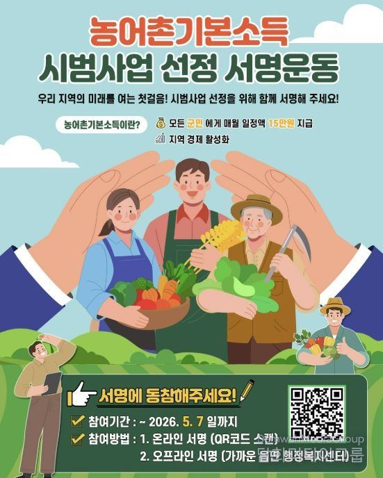 신미선 기획홍보과장은 "농어촌기본소득 시범사업 선정은 우리 지역의 미래를 여는 첫걸음"이라며 "지역의 내일을 바꾸는 서명운동에 적극 참여를 부탁드린다"고 말했다.