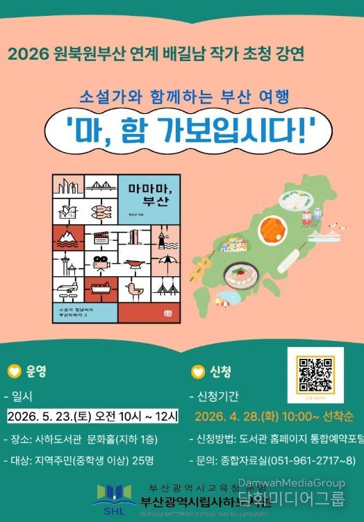 시민행정신문 기자 | 부산광역시립사하도서관은 다음달 23일 오전 10시 사하도서관 문화홀에서 청소년과 성인 25명을 대상으로 2026 원북원부산 연계 배길남 작가 초청 강연 ‘마, 함 가보입시다!’를 개최한다.
