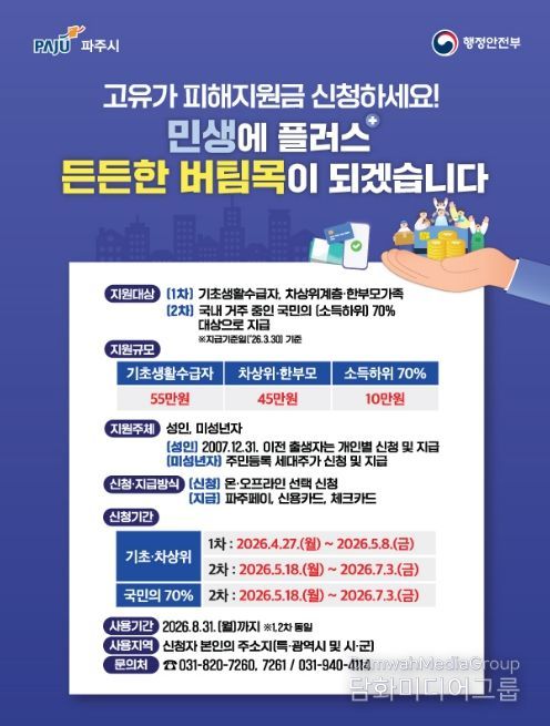 지원 금액은 기초생활수급자 55만 원, 차상위계층·한부모가구 45만 원이며, 신용·체크카드 또는 지역화폐(파주페이)로 지급된다. 이번 지원금의 사용기한은 지급일로부터 2026년 8월 31일까지이며, 기한 내 사용하지 않은 금액은 자동 소멸된다.
