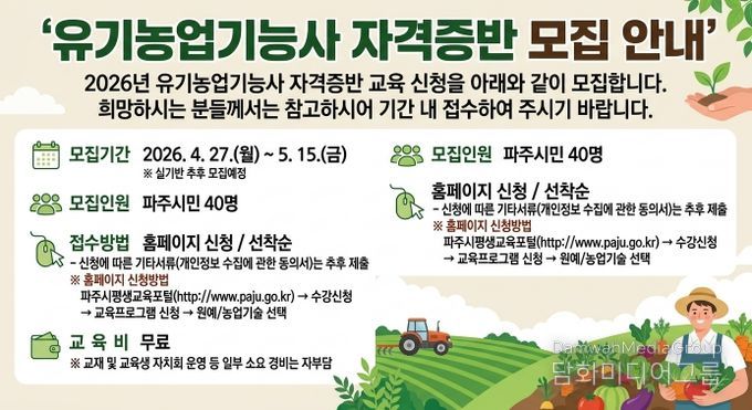 시민행정신문 강갑수 기자 | 파주시농업기술센터는 친환경농업 분야 농업 전문 인력 육성을 위한 '2026년 유기농업기능사 자격증 취득’교육생을 4월 27일부터 5월 15일까지 모집한다.