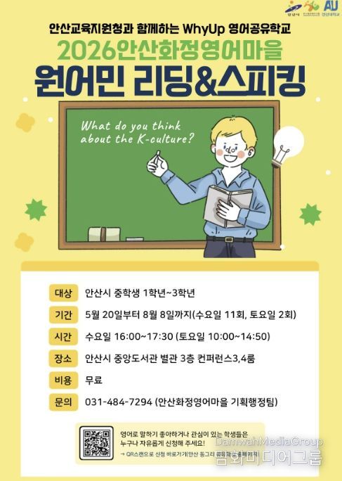 이번 프로그램은 ‘안산 동그리 공유학교’를 기반으로 운영되는 WhyUp 영어공유학교 사업의 일환으로 추진된다. 참가 신청은 27일 오전 9시부터 오는 30일 오후 6시까지 경기공유학교 누리집에서 온라인으로 하면 된다.