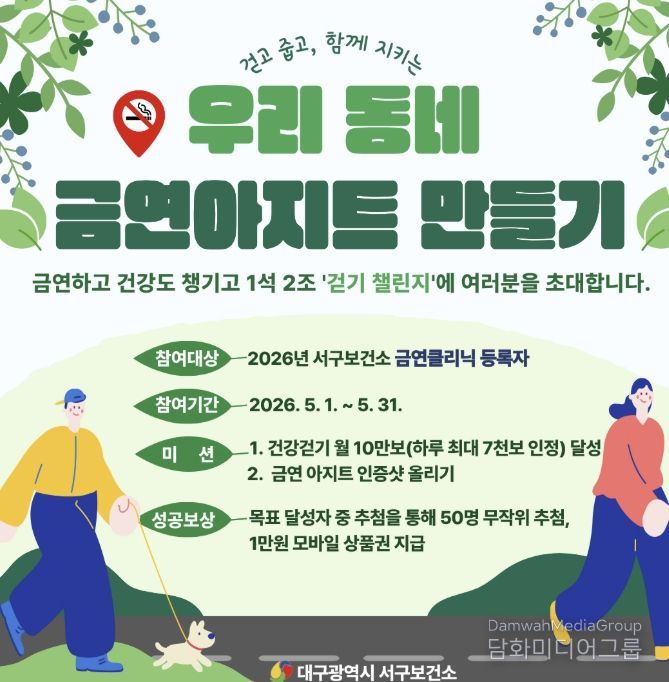 시민행정신문 기자 | 대구 서구보건소는 금연 시도자들이 일상에서 즐겁게 목표를 달성할 수 있도록 금연 실천과 신체 활동을 결합한 ‘우리 동네 금연 아지트 만들기’ 챌린지를 오는 5월부터 10월까지 본격 운영한다고 밝혔다.