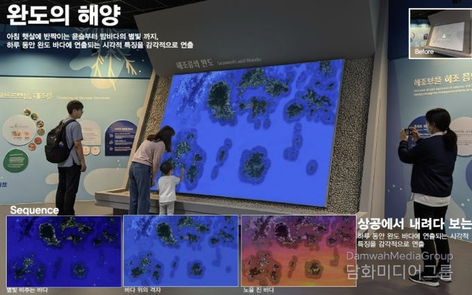 ‘이해관’은 해양생태계에 대한 호기심을 자극하는 미디어 체험 공간으로 마치 바닷속으로 들어가는 듯한 느낌을 주는 미디어 터널 ‘해저로의 초대’, 완도 바다의 하루를 프로젝션 맵핑으로 연출한 ‘완도의 해양’, 관람객 사진으로 인공지능(AI) 캐릭터를 생성해보는 ‘오션 스타’, 직접 색칠한 그림을 스크린에 띄우는 ‘라이브 오션’ 등 다양한 융합형 콘텐츠를 준비했다.