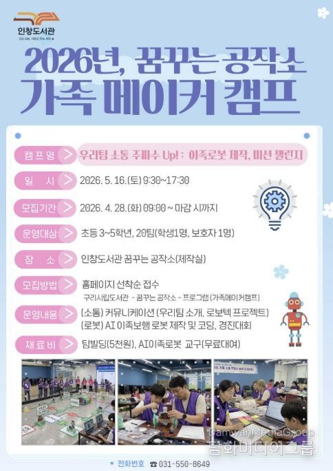시민행정신문 강갑수 기자 | 구리시 인창도서관‘꿈꾸는 공작소’는 오는 5월 16일 초등학생 자녀와 보호자가 함께 참여해 가족 간 유대감을 높이고 인공지능을 체험하는 '우리 팀 소통 주파수 Up! : 이족로봇 제작, 미션 챌린지' 가족 메이커 캠프를 운영한다고 밝혔다.