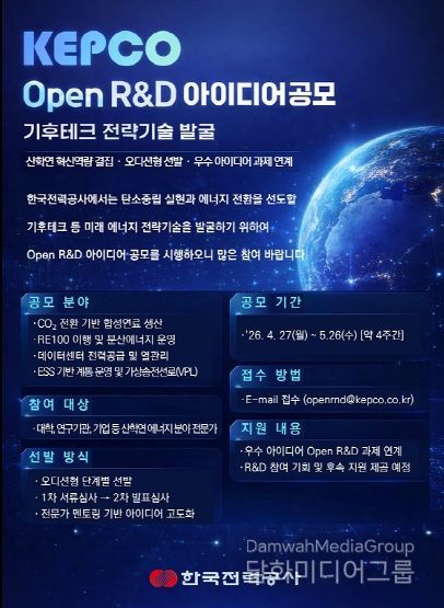 시민행정신문 이세훈 기자 | 한국전력이 기후테크 등 미래 에너지 전략기술 확보를 위해 산·학·연 혁신 아이디어를 발굴하는 'Open R&D 아이디어 공모'를 추진한다.