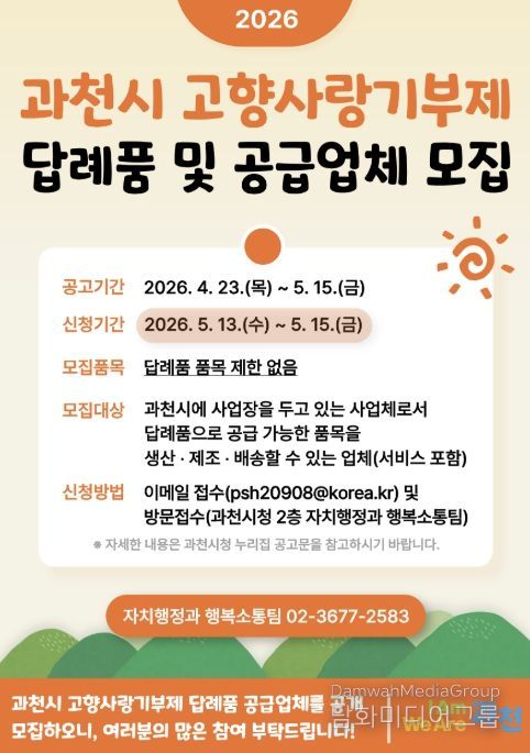 신청 대상은 답례품으로 제공할 수 있는 물품을 생산·제조하고 배송이 가능한 업체다. 참여를 희망하는 업체는 과천시 누리집 ‘과천소식'고시‧공고’에서 신청 서식을 작성한 뒤, 5월 13일부터 15일까지 전자우편 또는 과천시청 방문을 통해 서류를 제출하면 된다.