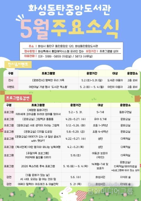 시민행정신문 기자 | 화성동탄중앙도서관이 어린이날과 가정의 달을 맞아 5월 한 달간 도서관 이용자와 시민을 대상으로 자료실과 3층 공공의 마당 등에서 다양한 문화행사를 운영한다.