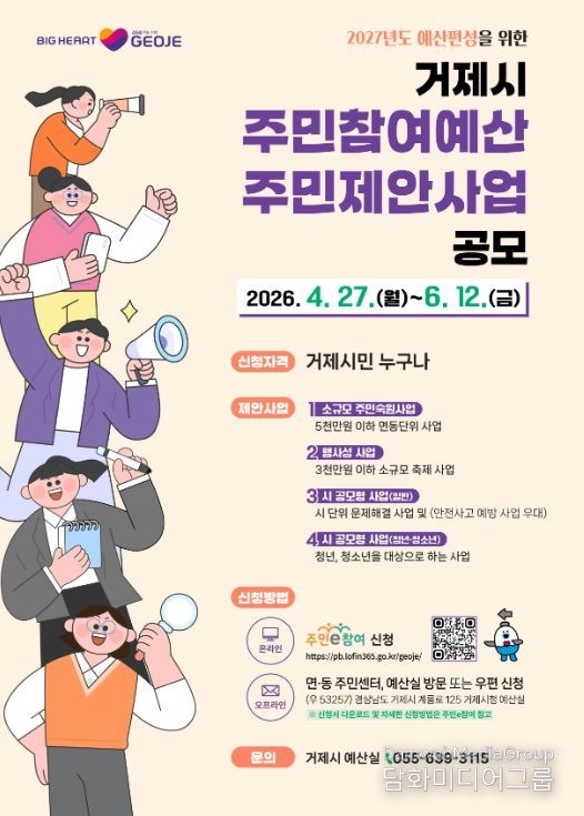 시민행정신문 강갑수 기자 | 거제시는 2027년도 본예산 편성을 앞두고 재정운용의 투명성과 시민에게 공감받는 예산편성을 실현하고자 오는 6월 12일까지‘주민참여예산 제안사업 공모’를 실시한다.