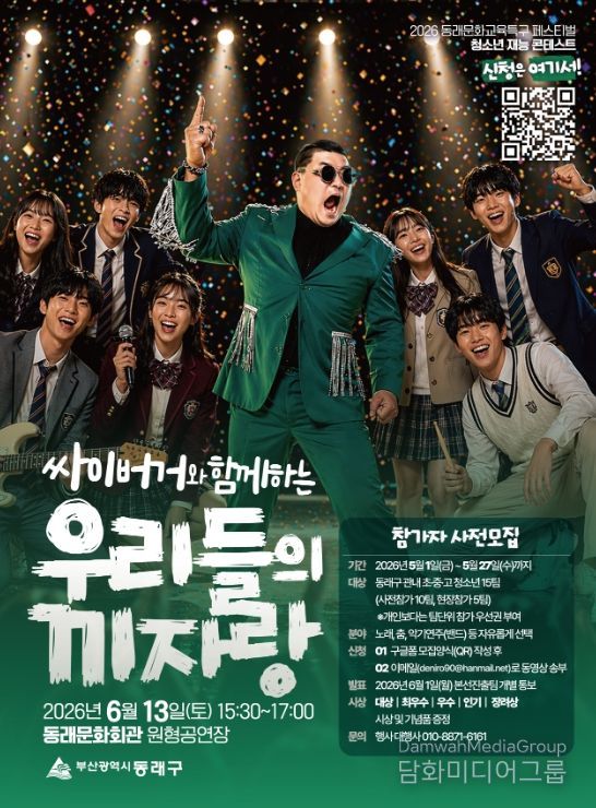 동래구 관계자는 “청소년들이 자신만의 재능을 자유롭게 표현하고 무대 경험을 쌓을 수 있는 좋은 기회가 될 것으로 기대한다”라며 “끼와 열정을 가진 많은 청소년들의 적극적인 참여를 바란다”라고 말했다.