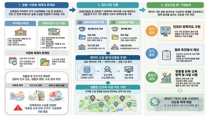 특히, 저출산으로 인한 지역 소멸 위기 확대에 따라 교육·보육 기반 시설(인프라)의 지역 간 격차는 심해지고 있으나, 유치원과 어린이집에 대해 교육청과 지자체가 각각 관리하고 있어 관련 정보의 연계 및 실질적 수요 반영이 미흡한 상황이다.