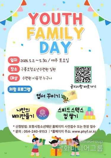 시민행정신문 강갑수 기자 | 포항시청소년재단 구룡포청소년수련원은 5월 가정의 달을 맞아 청소년과 가족이 함께 참여하는 체험형 프로그램 ‘2026년 5월 YOUTH FAMILY DAY’를 운영한다.