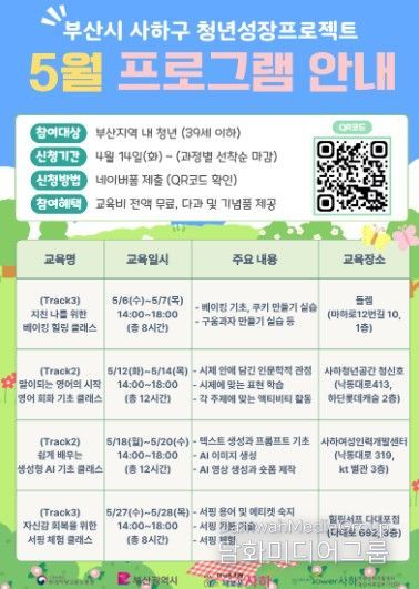 참여를 희망하는 청년은 홍보 포스터 내 ‘정보 무늬(QR코드)’를 통해 신청 가능하며, 자세한 사항은 수행기관인 사하여성인력개발센터로 문의하면 된다.