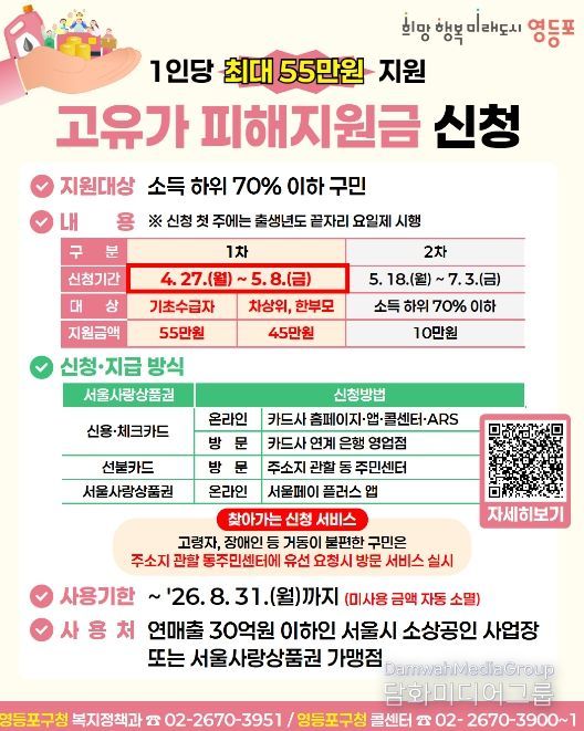 영등포구 복지정책과장은 “고유가로 어려움을 겪는 구민들의 생활 안정에 실질적인 도움이 되길 바란다”라며 “신청 기간을 확인해 대상자 누락 없이 혜택을 받으시길 바란다”라고 전했다.