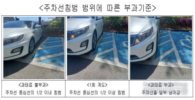 시에 따르면, 차량이 주차선 중심선을 기준으로 절반 이하만 침범한 경우에는 일부가 선에 걸쳐 있더라도 과태료를 부과하지 않는다. 그러나, 중심선을 기준으로 절반 이상 넘어간 경우에는 주차선 침범으로 간주하며, 최초 1회에 한해 계도 조치가 이루어진다. 다만, 차량이 주차구획선을 명확히 넘어 장애인전용주차구역 안으로 일부라도 침범한 경우에는 관련 법령에 따라 10만 원의 과태료를 부과한다.