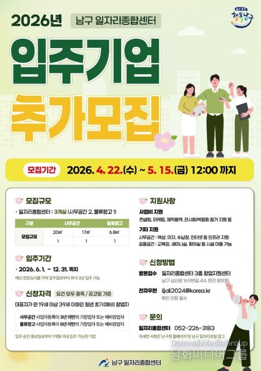 시민행정신문 이세훈 기자 | 울산 남구는 청년들에게 창업공간을 지원해 안정적으로 사업을 수행할 수 있도록 남구 일자리 종합센터 사무공간 및 물류창고에 입주할 기업을 추가 모집하고 있다고 28일 밝혔다.