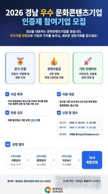 시민행정신문 이세훈 기자 | 경상남도는 ‘2026년 경남 우수 문화콘텐츠기업 인증제’ 참여 기업을 4월 29일부터 5월 29일까지 한 달간 모집한다고 밝혔다.