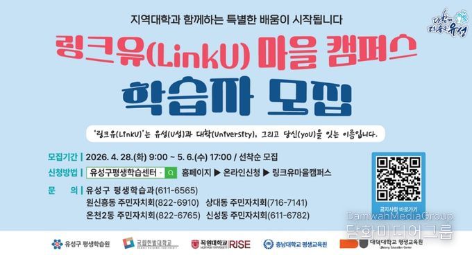 시민행정신문 강갑수 기자 | 대전 유성구는 5월부터 지역대학과 연계한 주민 밀착형 평생학습 ‘링크유(LinkU) 마을캠퍼스’ 상반기 프로그램을 운영한다.