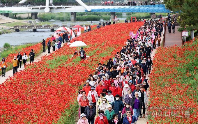 축제의 백미는 동진천변에 펼쳐진 거대한 붉은 봄꽃 군락이다. 왕복 3.3킬로미터(km) 구간을 따라 양귀비 10만 본, 작약 16만 본, 꽃잔디 8만 본을 가득 심고 끝없는 붉은 꽃물결을 빚어냈다.