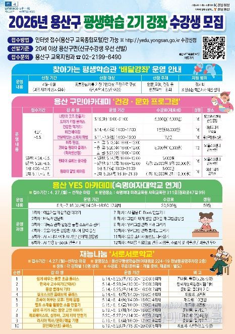 시민행정신문 강갑수 기자 | 서울 용산구가 구민의 자기계발과 평생학습 참여 기회 확대를 위해 ‘2026년 평생학습 2기 강좌’를 본격적으로 운영하고, 수강생 모집에 나섰다.