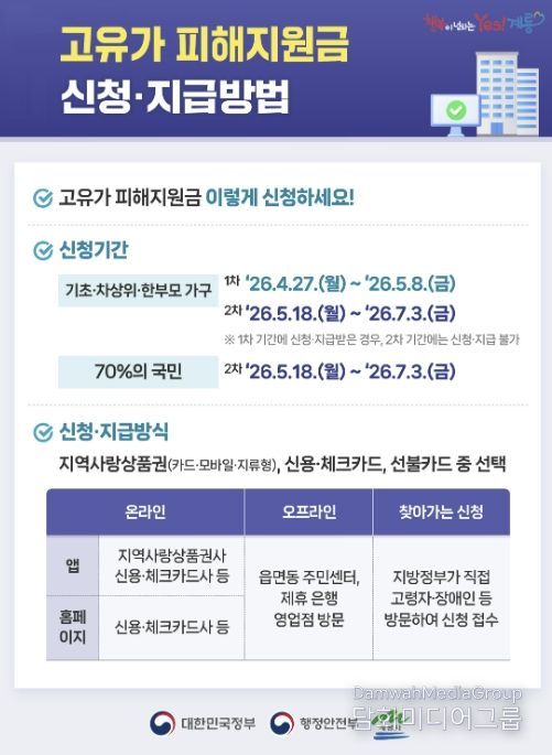 고유가 피해지원금은 1차로 4월 27일부터 5월 8일까지 취약계층을 대상으로 우선 지급하며, 2차는 기준 중위소득 70% 이하 가구를 대상으로 5월 18일부터 7월 3일까지 순차 지급한다.