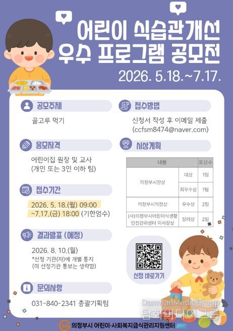 시민행정신문 강갑수 기자 | 의정부시가 운영하는 의정부시 어린이‧사회복지급식관리지원센터는 어린이 보육시설을 대상으로 5월 18일부터 7월 17일까지 ‘어린이 식습관 개선 우수 프로그램 공모전’을 개최한다.