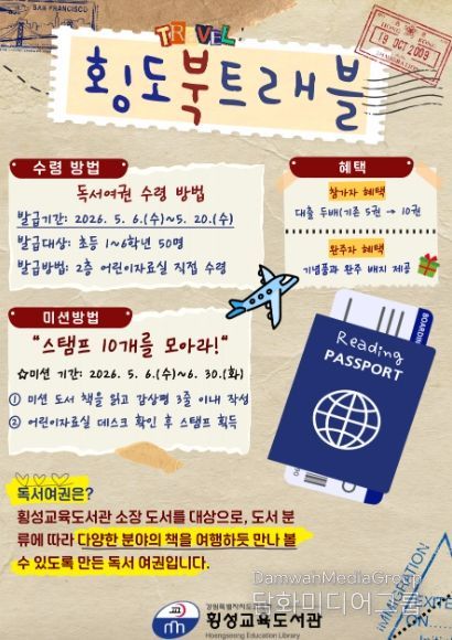 시민행정신문 기자 | 횡성교육도서관은 5월 6일부터 6월 30일까지 어린이들의 자발적인 독서 습관 형성과 도서관 이용 활성화를 위해 독서 여권을 활용한 ‘횡도북트래블’ 프로그램을 운영한다고 밝혔다.