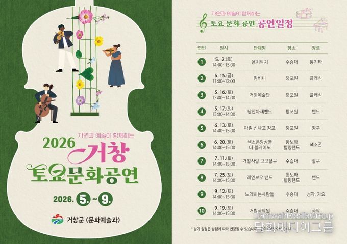 공연은 5월 2일 ‘음치박치’의 통기타 공연을 시작으로 9월 19일 ‘거창국악원’의 국악 공연까지 총 10회에 걸쳐 이어진다. 국악, 클래식, 밴드, 통기타 등 다양한 장르의 공연이 매회 60분 동안 펼쳐지며, 야외 공간과 어우러진 생동감 있는 무대를 선사할 예정이다.
