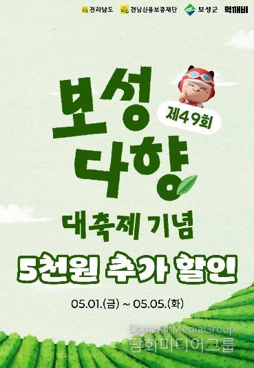 시민행정신문 강갑수 기자 | 보성군은 제49회 보성다향대축제를 맞아 5월 1일부터 5일간 공공배달앱 ‘먹깨비’를 활용한 추가 할인 행사를 진행한다고 밝혔다.